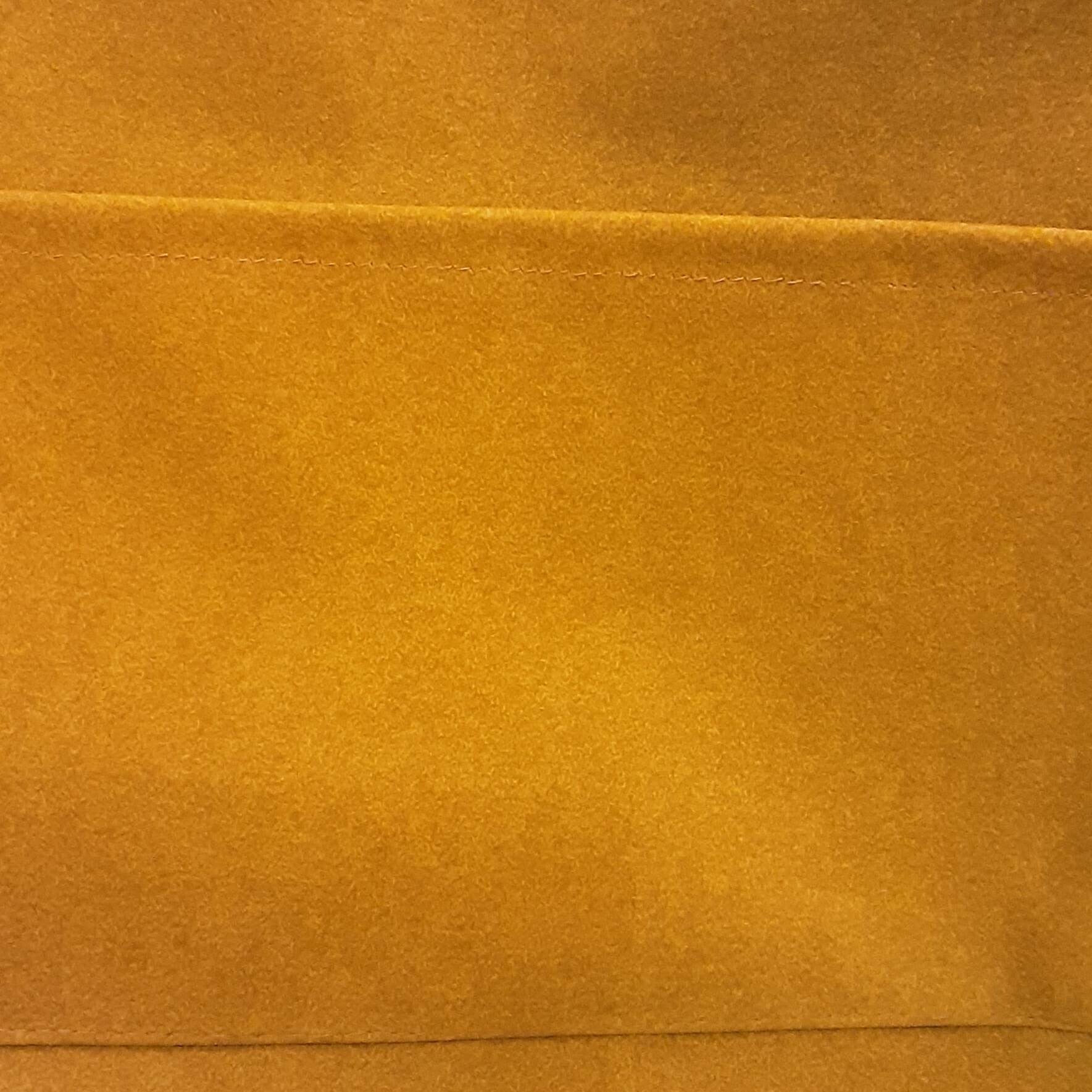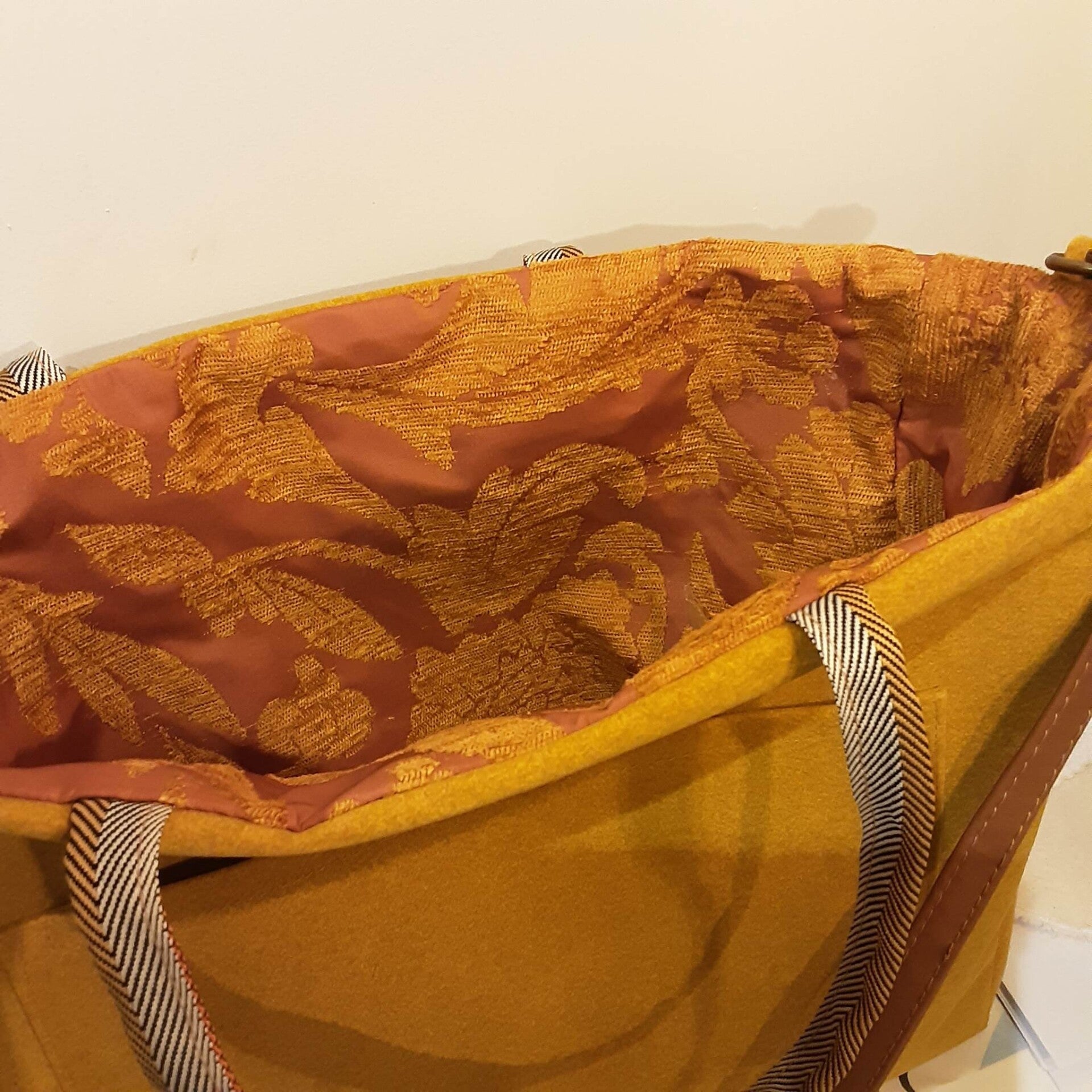 De tas is okerkleur, met gekleurde handriemen en een bruine lederen schouderriem.